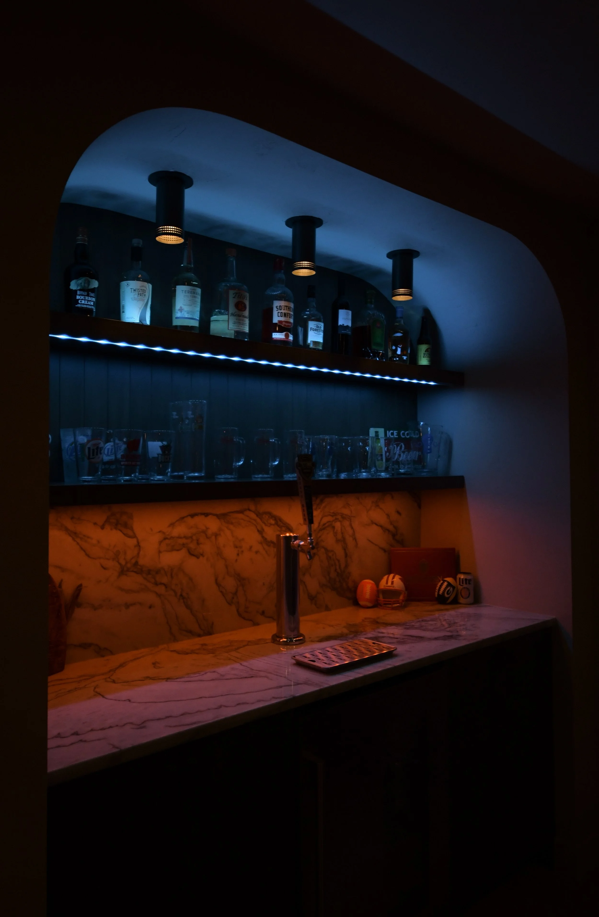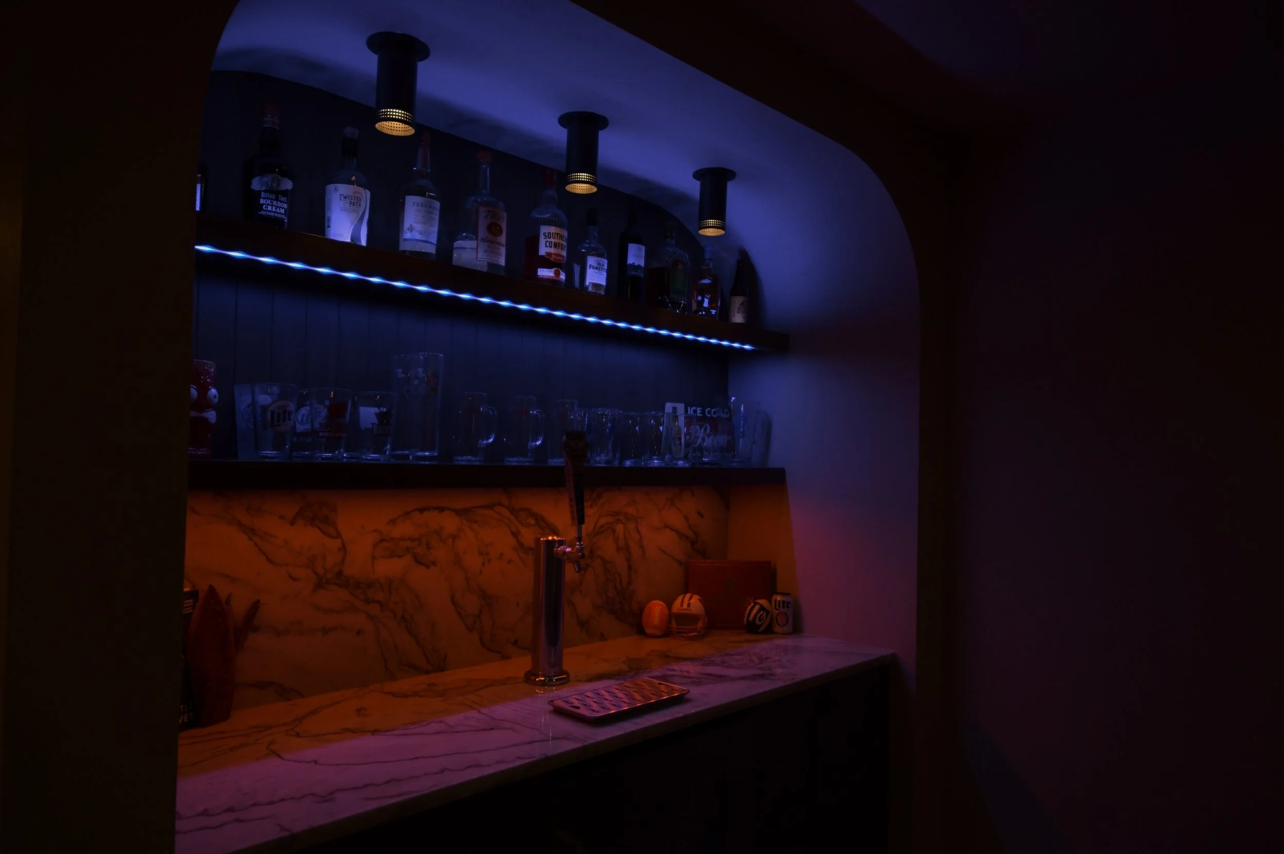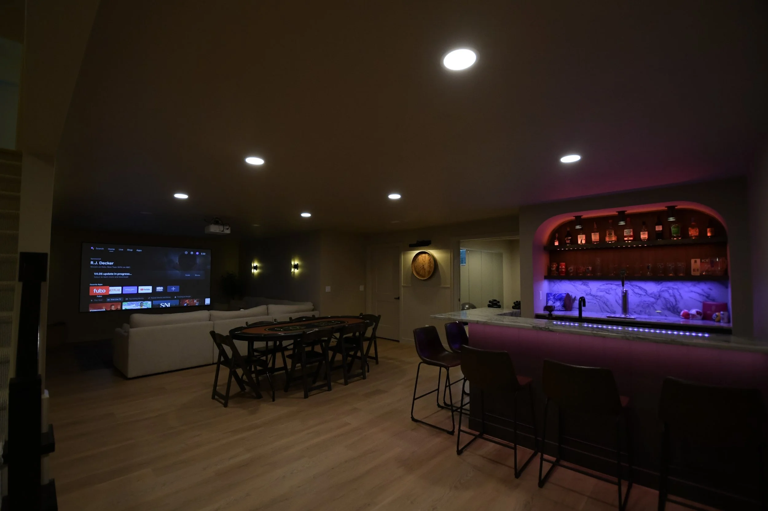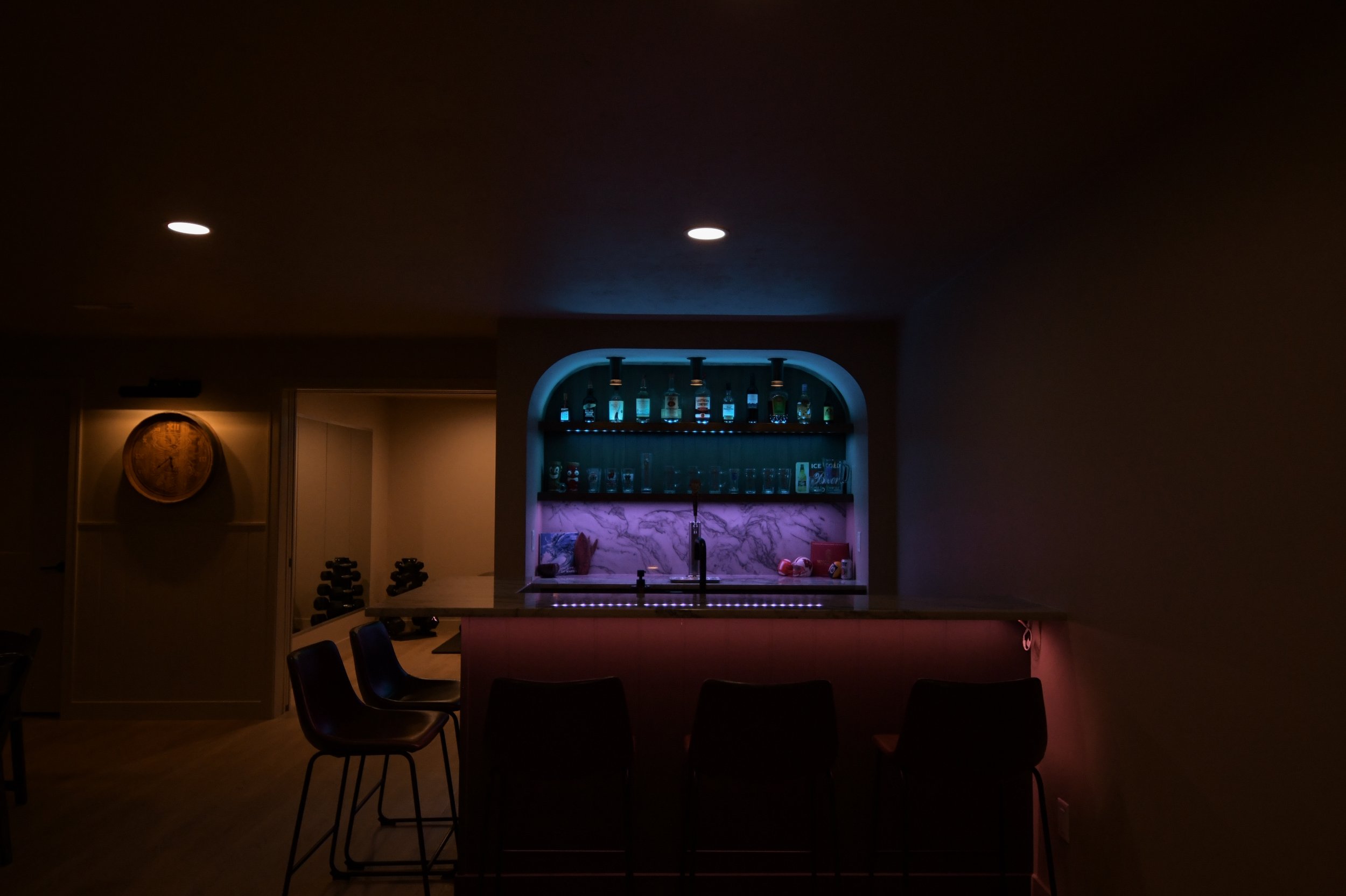 Walking downstairs from the bright, airy upper level into the ultimate man cave. The basement includes a dedicated theater, a distinctive bar, a workout room, and a sauna. The bar showcases Brazilian quartzite with a full-height backsplash and a striking waterfall edge. The back wall features a custom arch, quartzite backsplash, V-groove maple paneling, color-changing accent lighting, and even a keg, every detail crafted for style and entertainment.