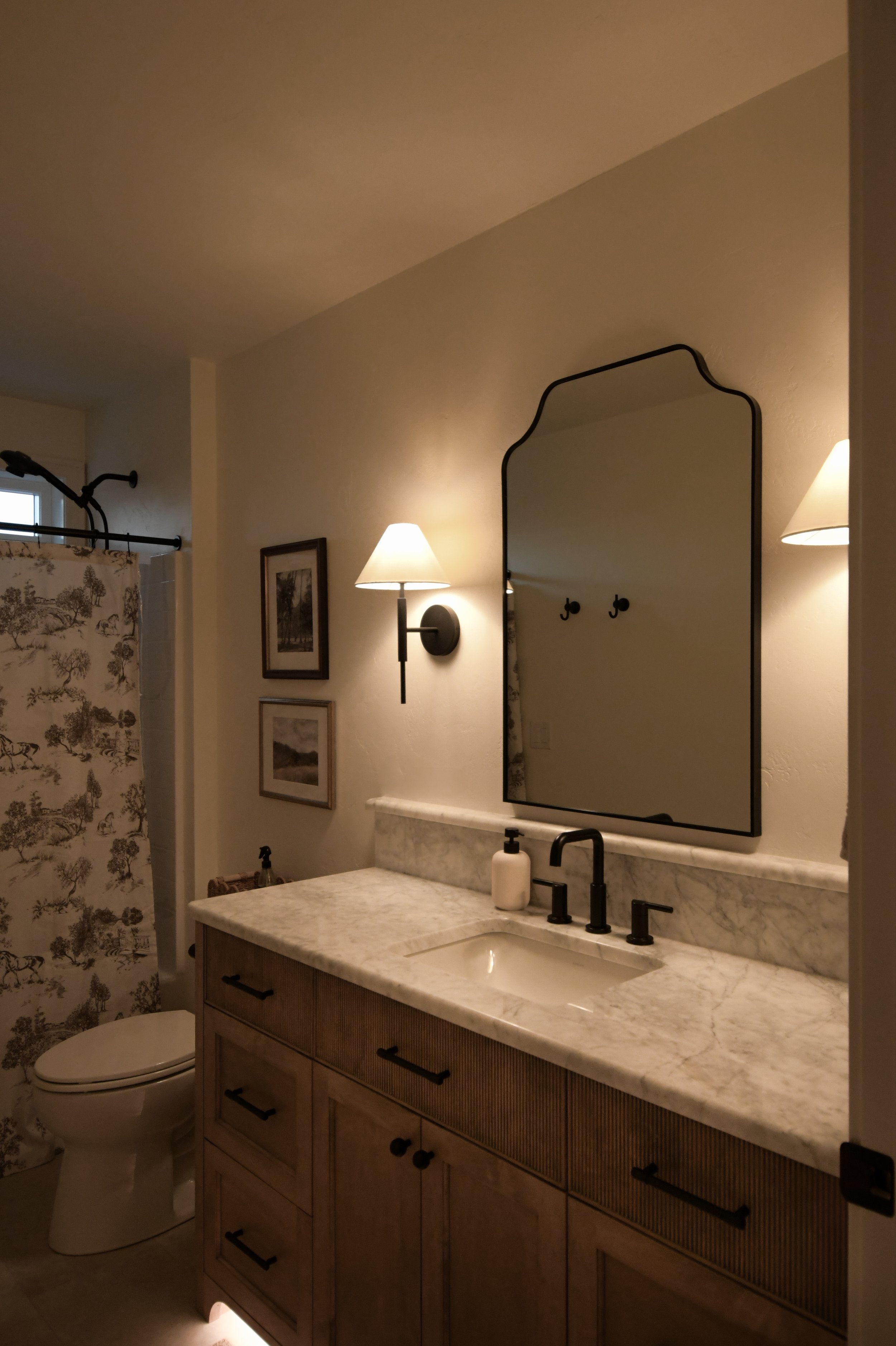 The guest bath features a carara marble countertop from Italy with a soft touch up a bullnose edge and shelf detail. The custom maple vanity has reeded top drawer fronts and an arched toe kick detail with automatic toe kick lighting.
