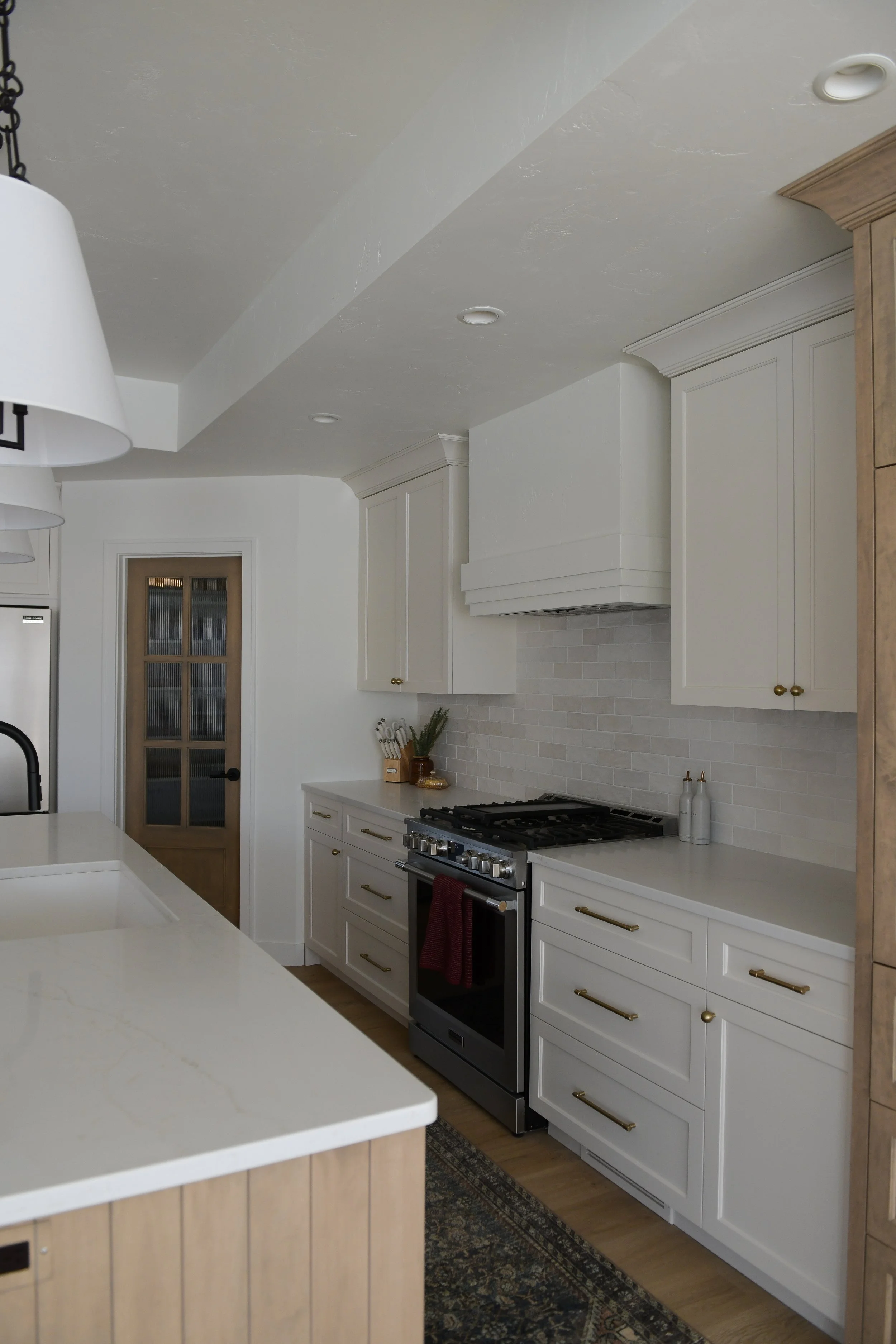 The elegant kitchen pairs creamy white paint with light maple stain for a warm, cohesive palette. A zellige backsplash in layered white tones ties together the countertops, cabinetry, and walls, introducing texture and gentle depth.