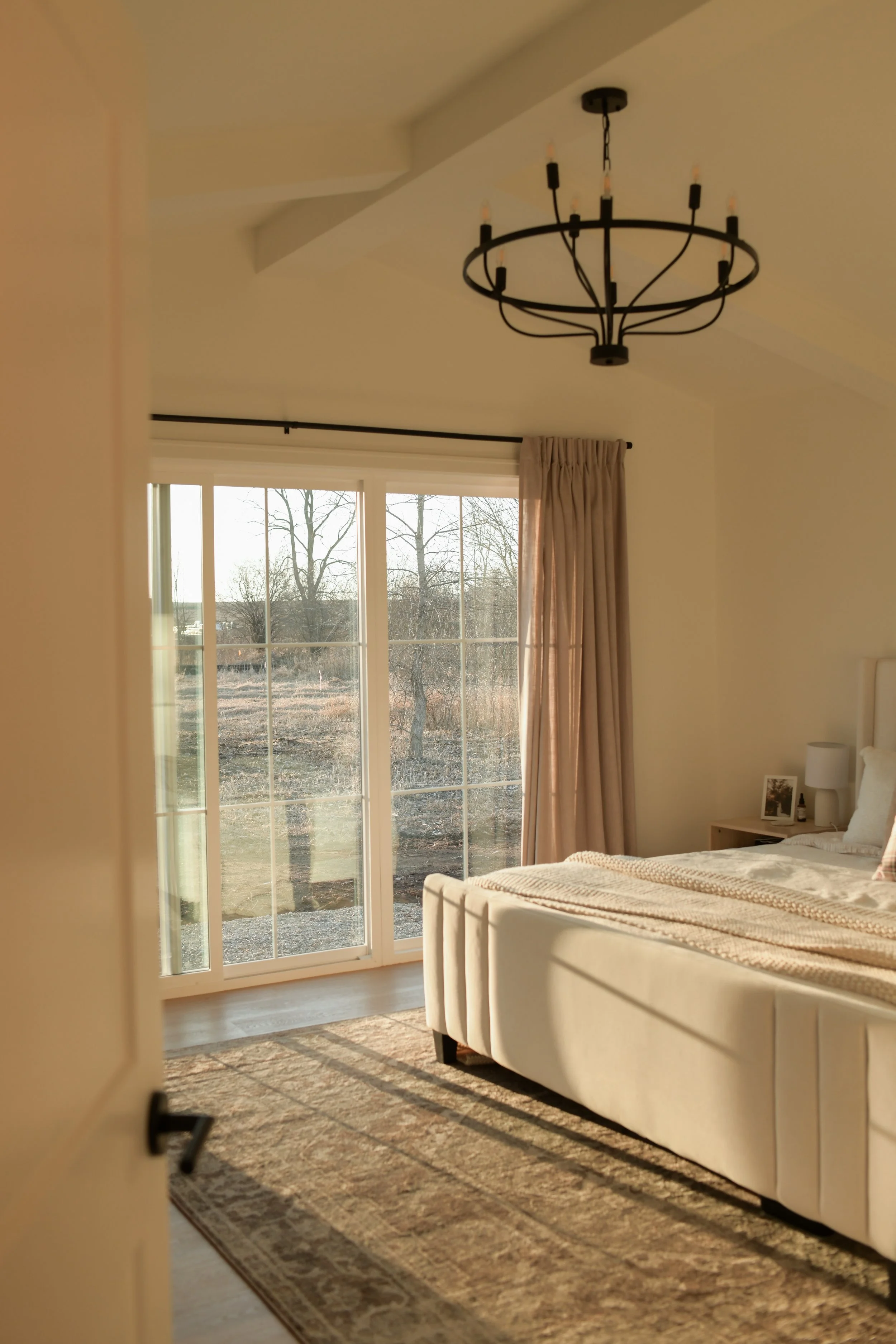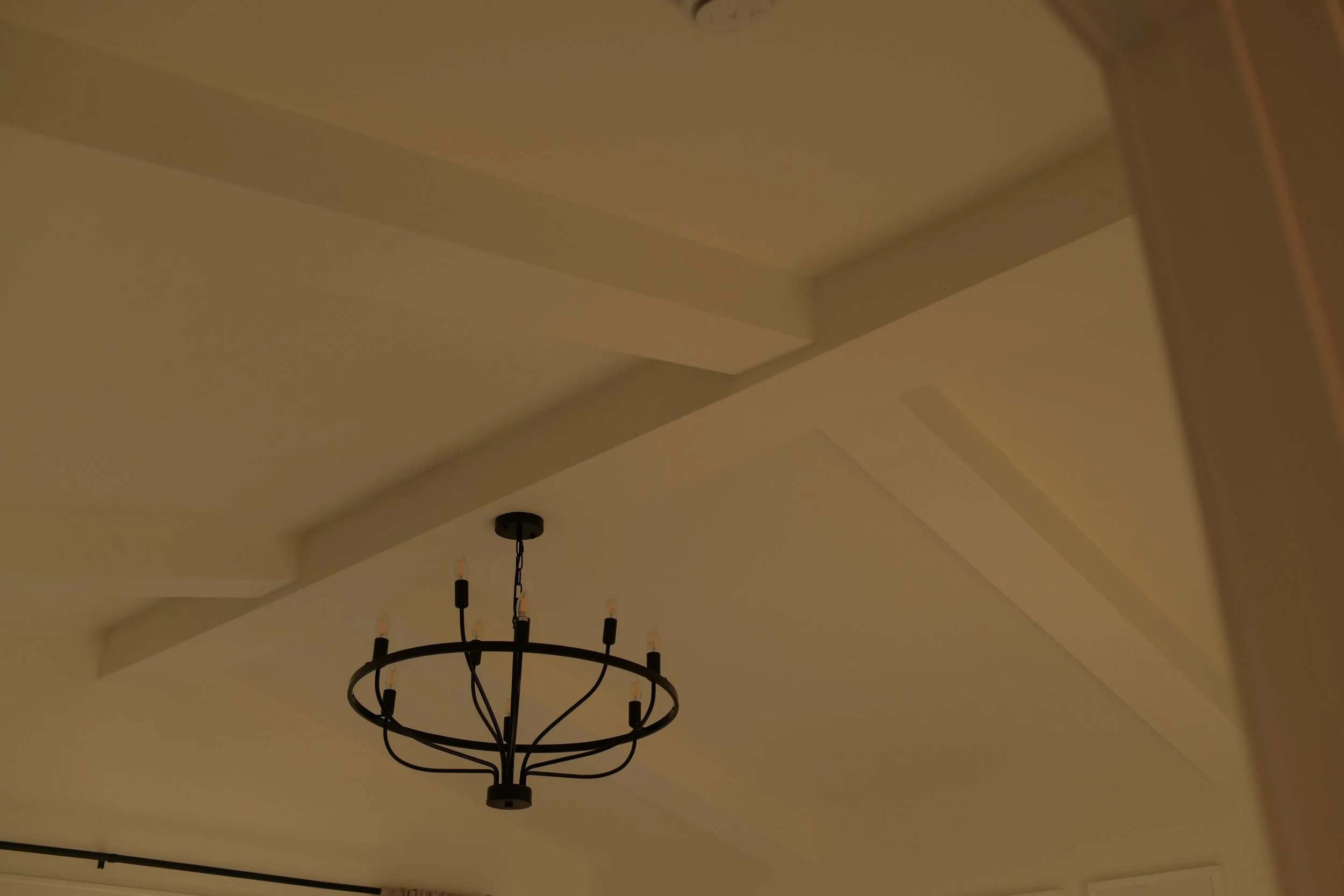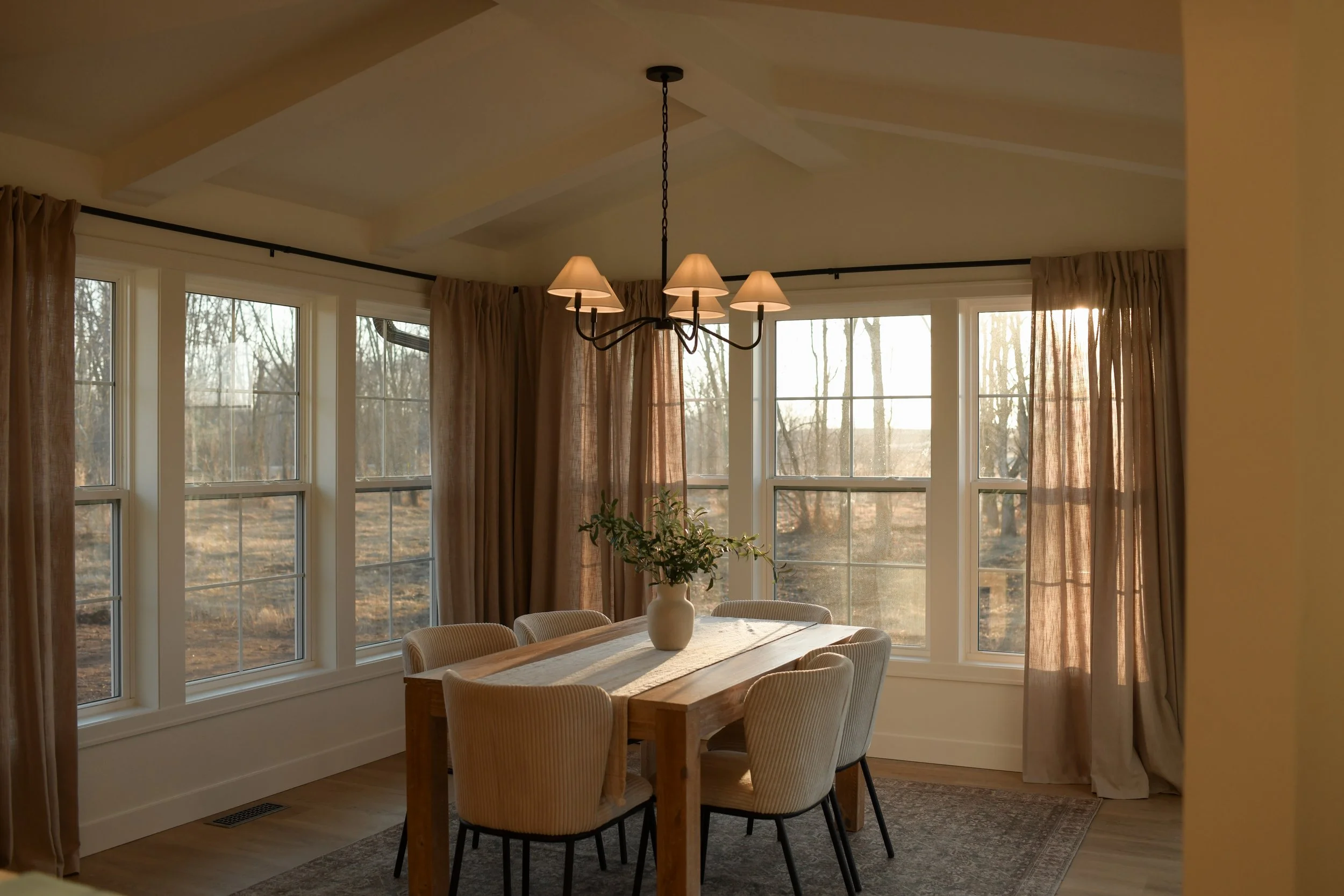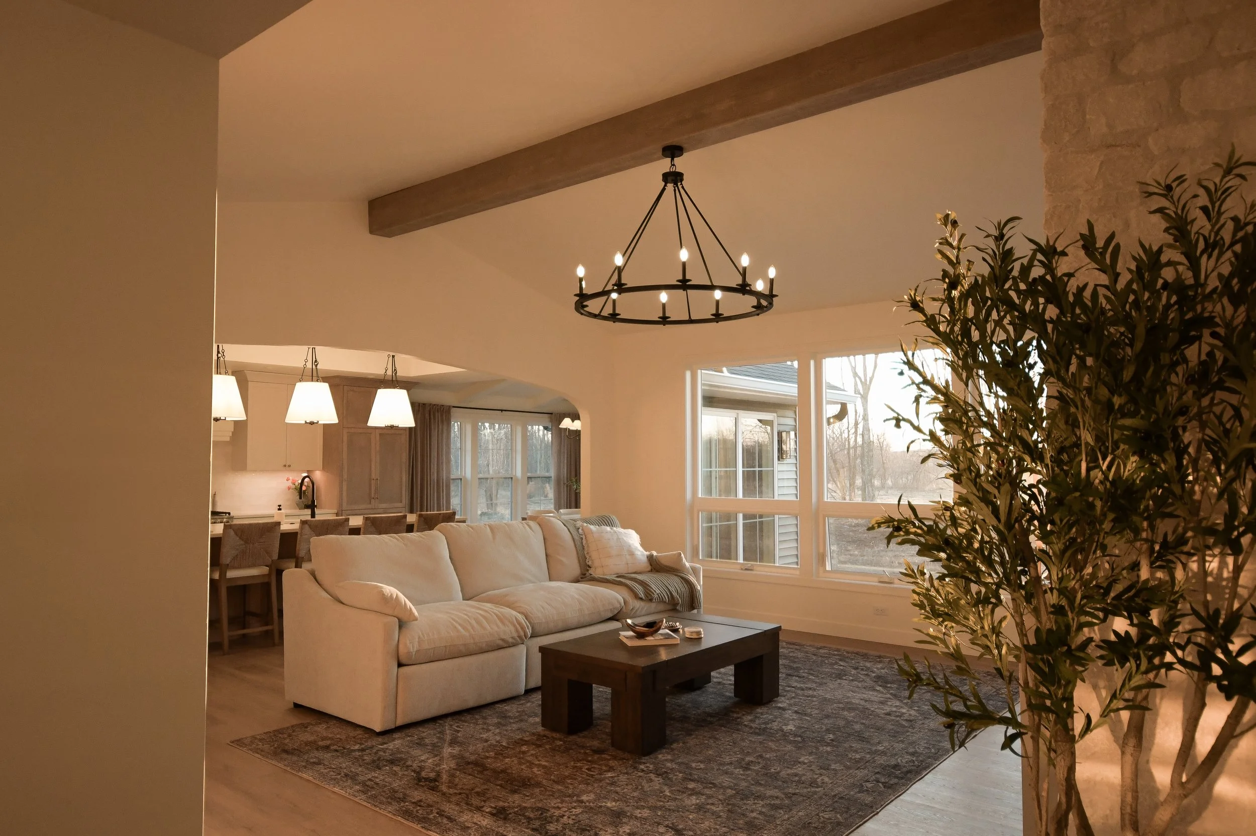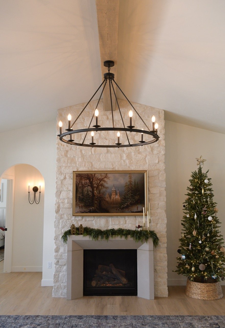 The west-facing dining and living rooms is flooded with natural light espicially as the sun begins to set. A European-inspired, floor-to-ceiling creamy stone fireplace, crafted with a flush mortar joint and a custom cast-stone mantel, is a beautiful focal point in the space. A TV is discreetly integrated above the mantel; with an inset mount, framed TV, and decorative frame, it reads as a curated design element rather than equipment. The transition from catheral to flat ceiling with arches and ceiling beams makes the open concept space feel inviting but cozy.