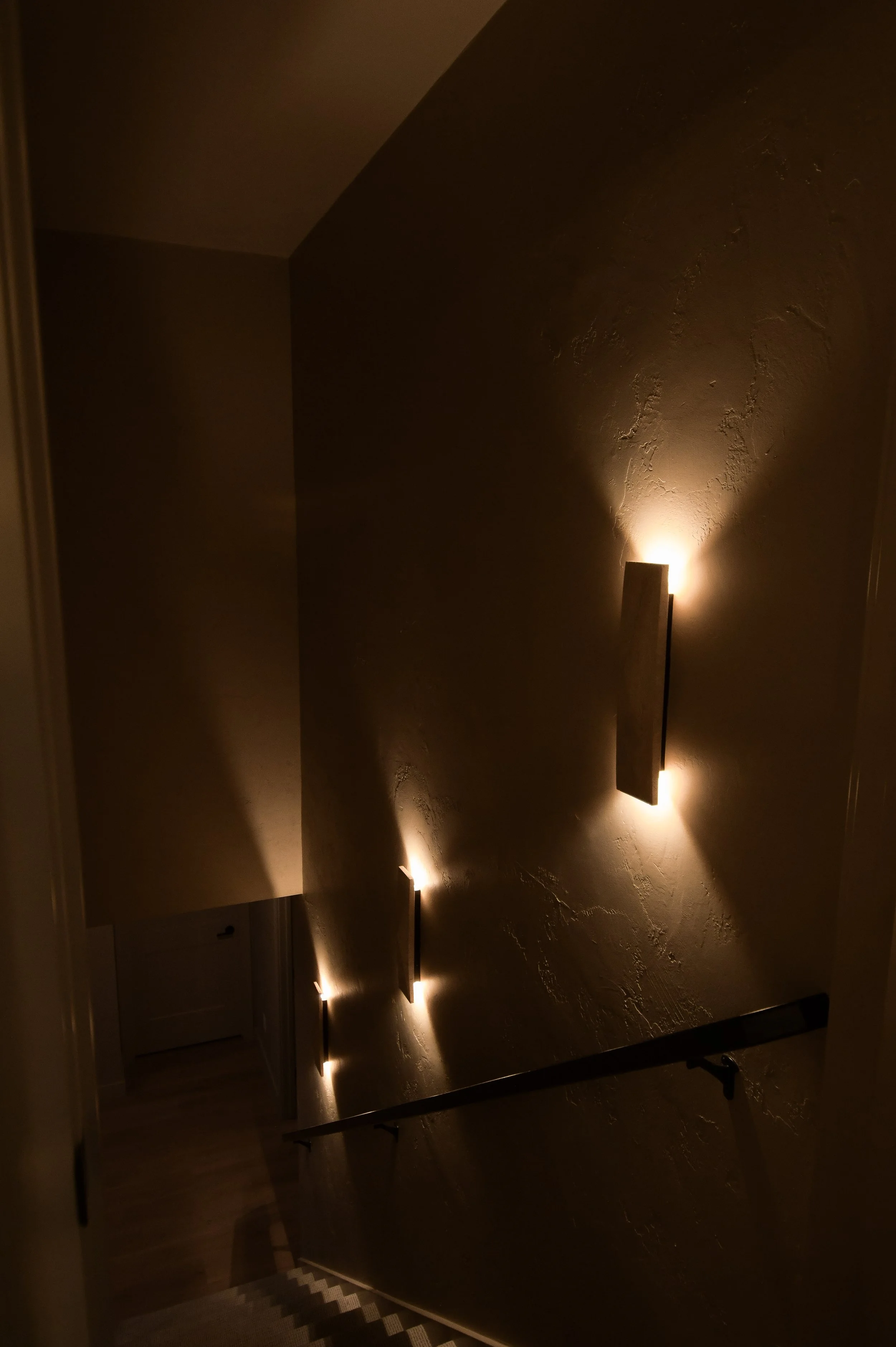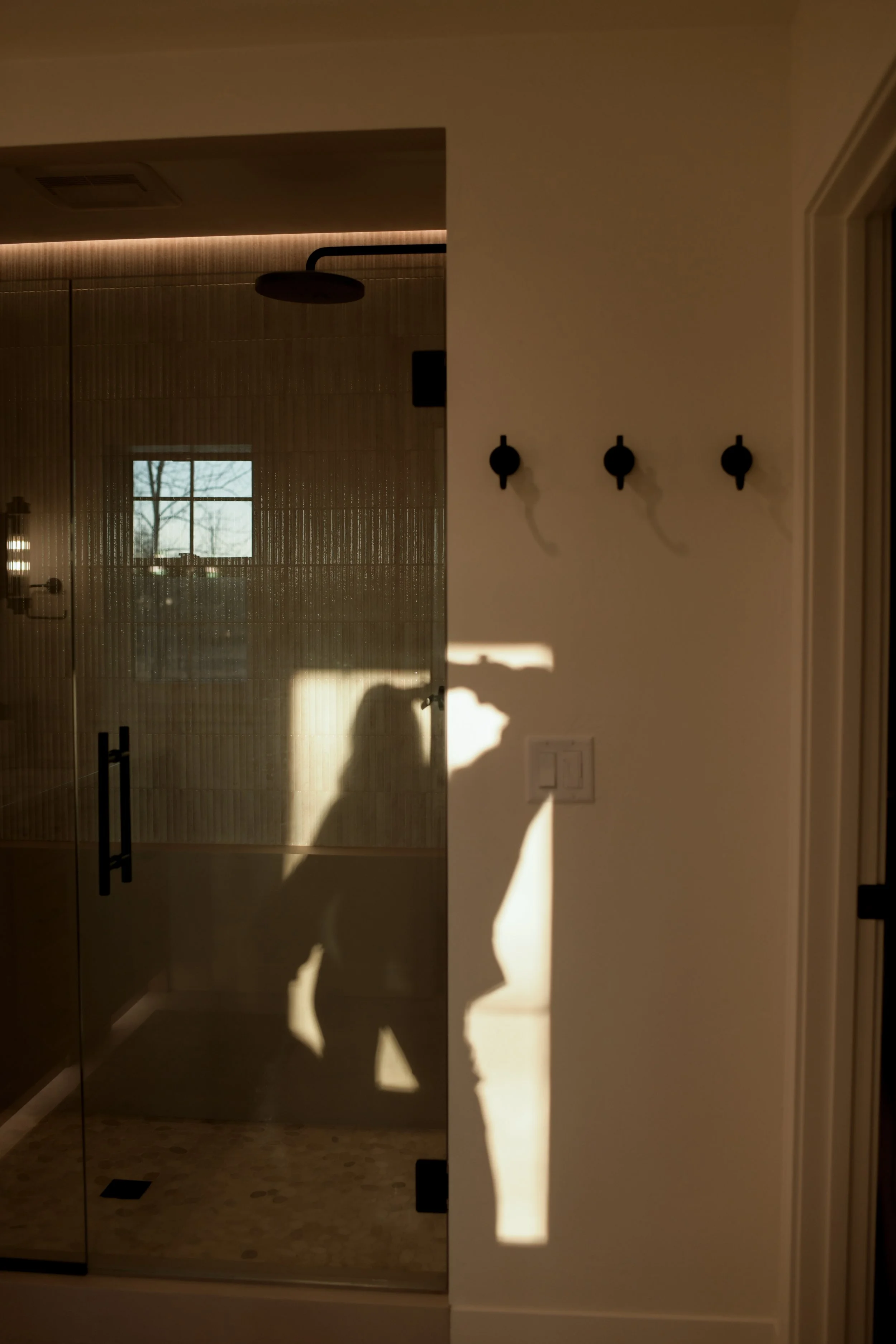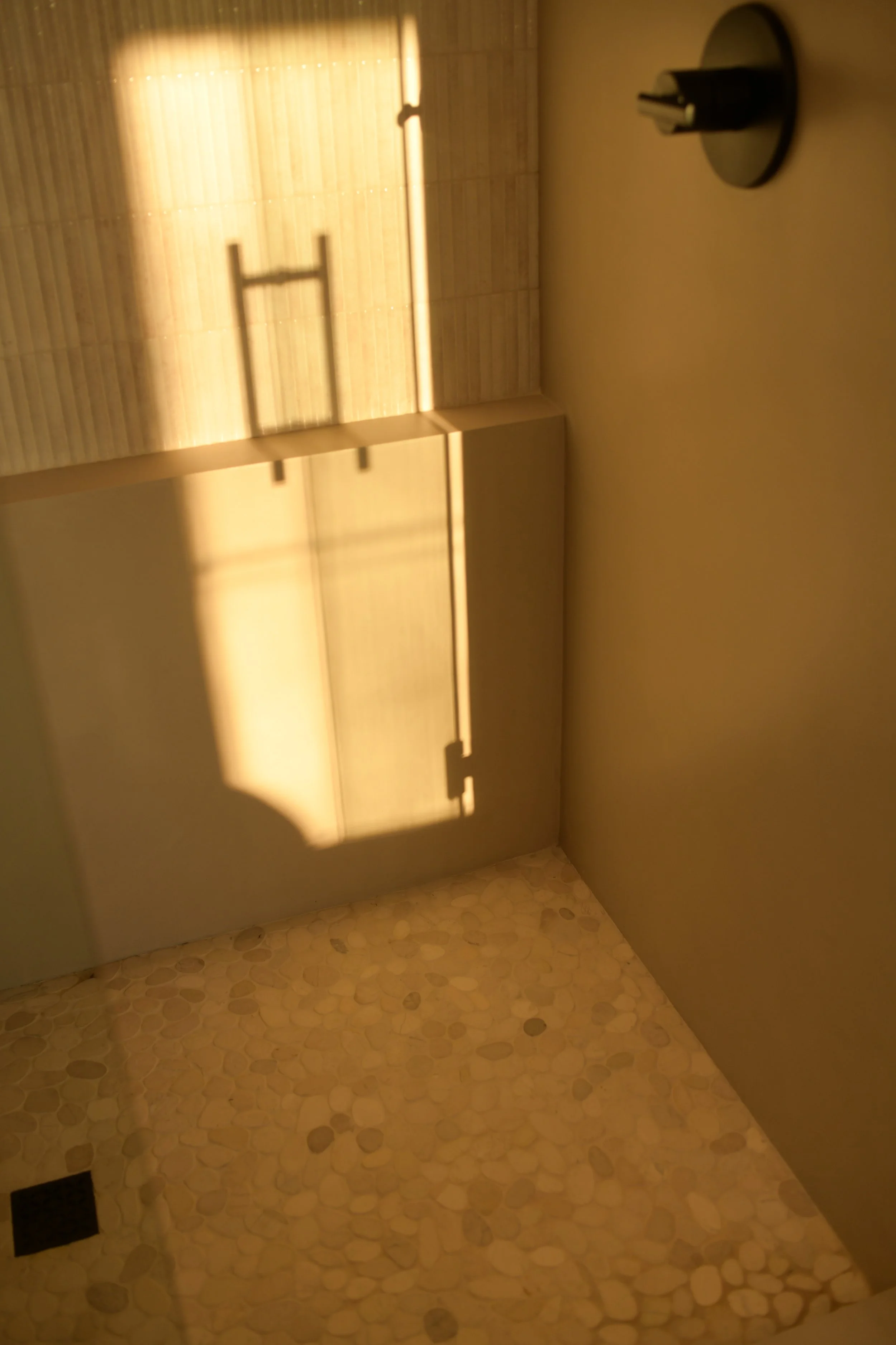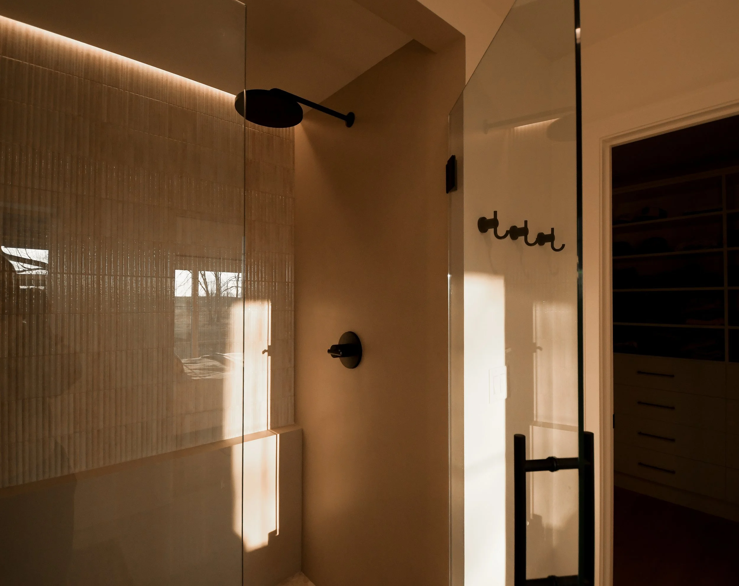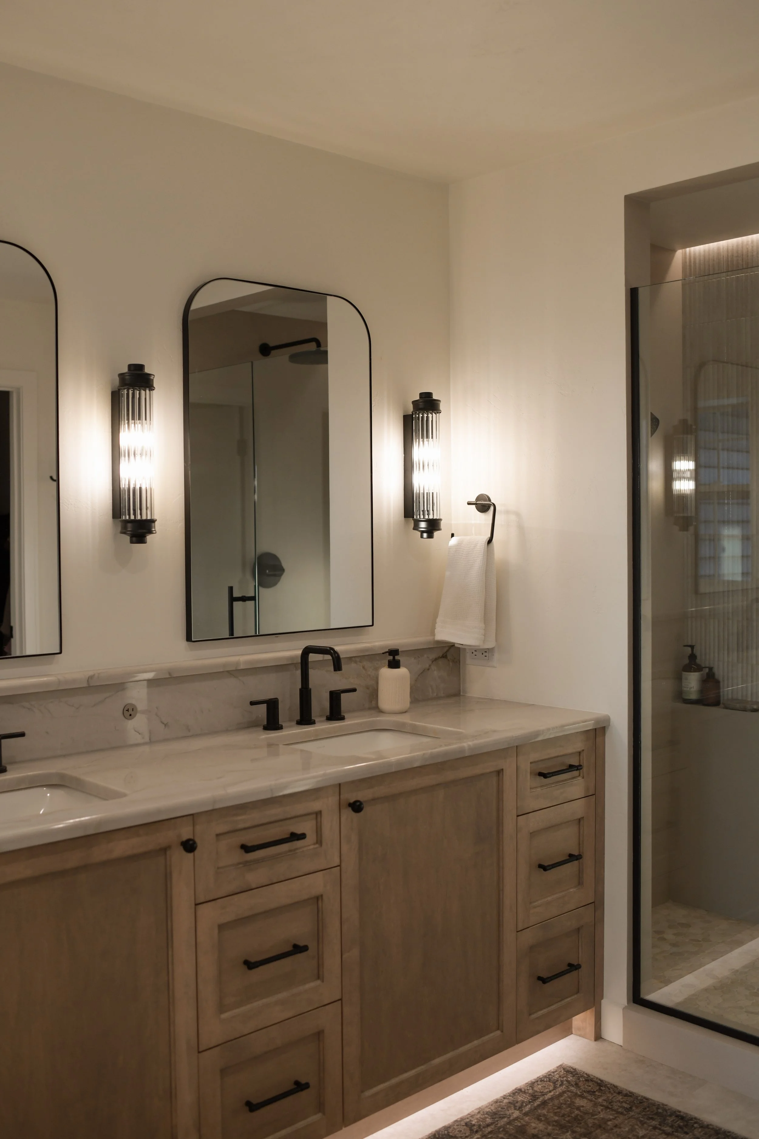 The vision for the primary suite was to feel like a luxury resort getaway, gathering inspiration from travels abroad. The shower features a combination of European micro-cement, reeded tile, and a riverrock floor. The custom vanity is built of maple with a light neutral stain, topped with a quartzite countertop from Brazil. Accent lighting and dimmer switches elevate the spa feel with automatic toe kick lighting under the vanity, sconces, and a waterproof light channel in the shower.
