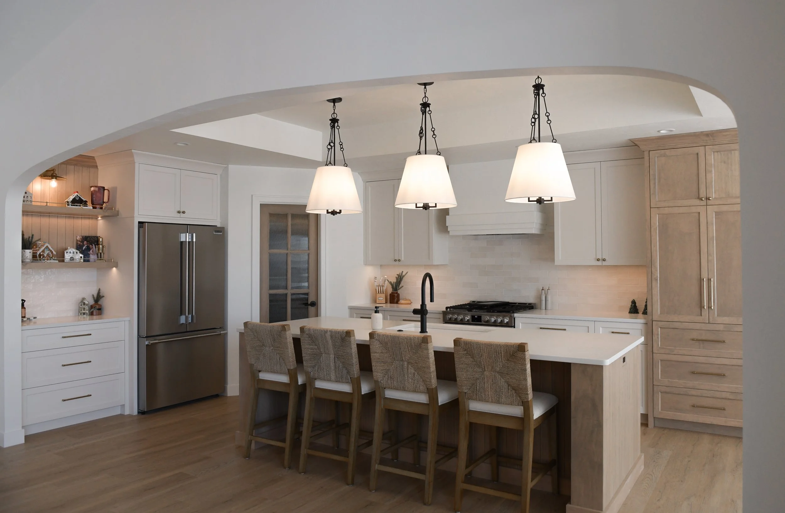 The European Ranch Project features a warm and creamy upstairs living area layered with a mix of materials, including quartzite, marble, reeded glass, and more, creating an elegant, textured atmosphere. Below, a moody man cave unfolds with deep taupe walls, rich dark wood, and custom-built details.